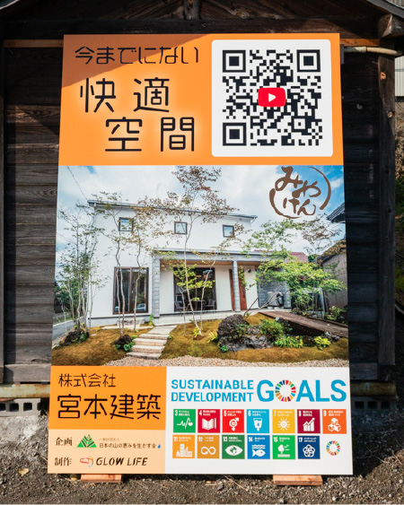 工場へは「未来の子供達へつなぐ宮本建築の家造り」の文字とQRコードの付いた看板を目印にお越しください。